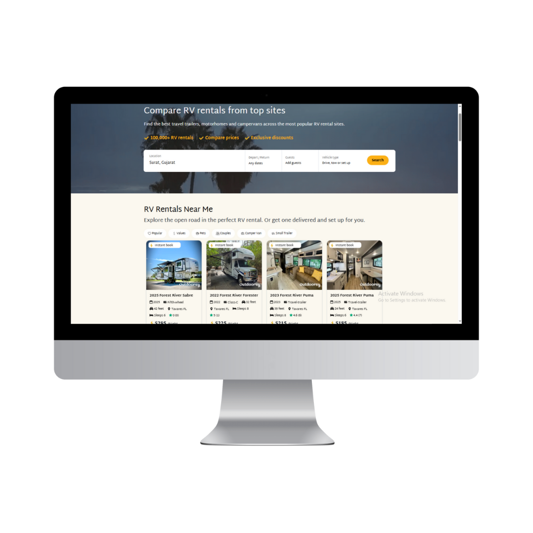 RvThereYet.com helps users search and compare RV rentals like campervans, motorhomes, and travel trailers from multiple partner marketplaces to find deals and book vehicles for road trips and camping adventures. The site includes listings from major providers and travel resources for planning trips.
